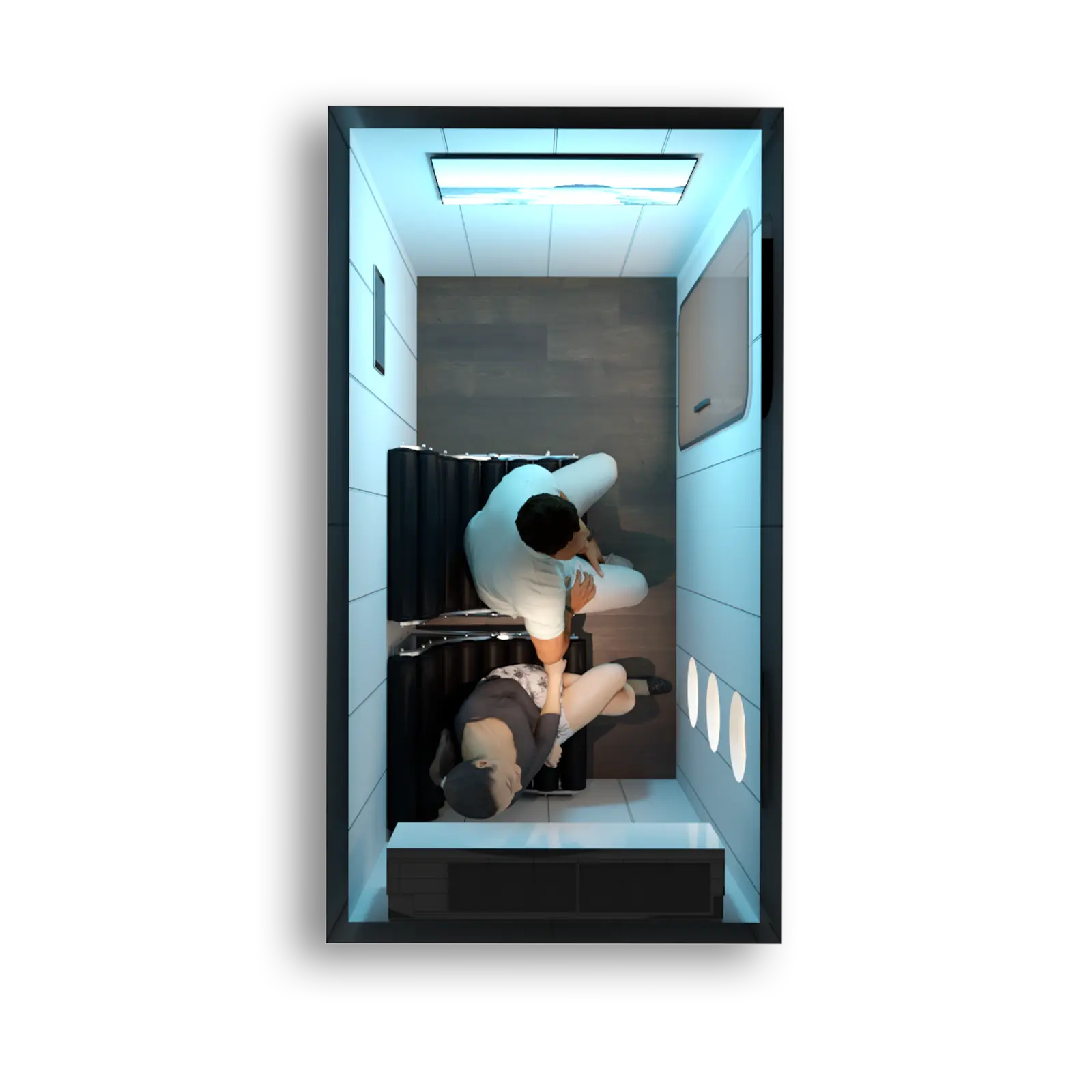 Der endgültige Aufbau sowie die Abmessungen der Kammer können je nach gewähltem Druckniveau geringfügig variieren, was auf technologische Gegebenheiten zurückzuführen ist. Die Visualisierungen dienen lediglich zur Veranschaulichung. Die empfohlene Anzahl an Personen, die die Kammer nutzen können, hängt von ihrer internen Konfiguration ab.