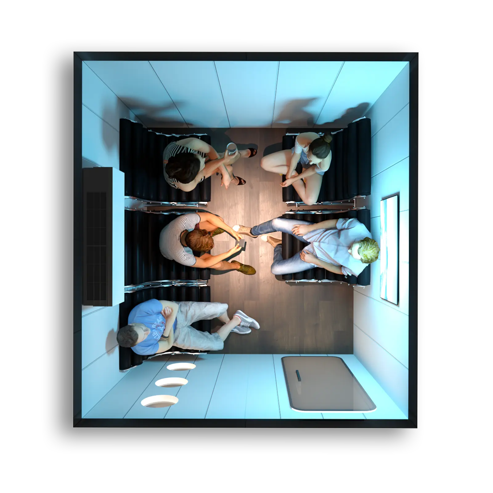 Der endgültige Aufbau sowie die Abmessungen der Kammer können je nach gewähltem Druckniveau geringfügig variieren, was auf technologische Gegebenheiten zurückzuführen ist. Die Visualisierungen dienen lediglich zur Veranschaulichung. Die empfohlene Anzahl an Personen, die die Kammer nutzen können, hängt von ihrer internen Konfiguration ab.