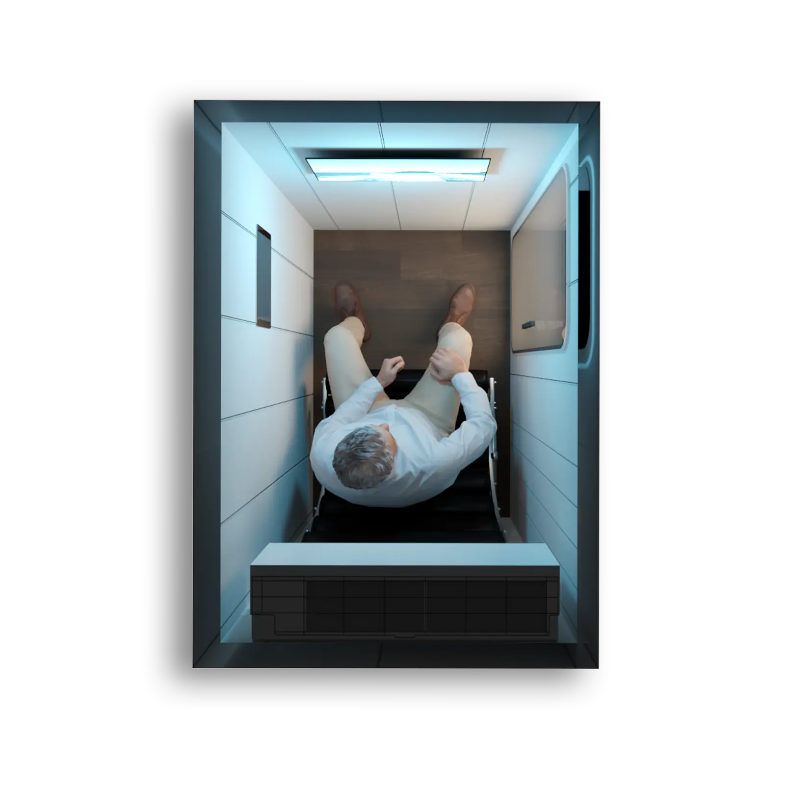 Der endgültige Aufbau sowie die Abmessungen der Kammer können je nach gewähltem Druckniveau geringfügig variieren, was auf technologische Gegebenheiten zurückzuführen ist. Die Visualisierungen dienen lediglich zur Veranschaulichung. Die empfohlene Anzahl an Personen, die die Kammer nutzen können, hängt von ihrer internen Konfiguration ab.
